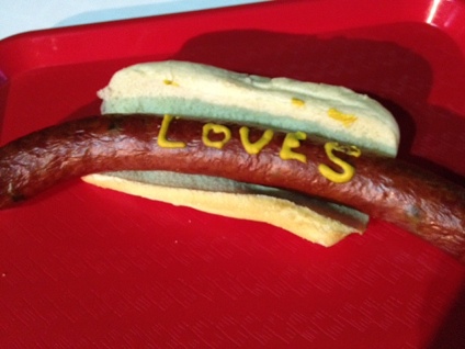 The brilliant writer Harlan Ellison did his second speaking engagement at the Cinefamily theater. Before that, he gathered with friends and followers and his beautiful wife Susan at the famous Pink’s Hot Dogs. Pinks had presented him with four dogs that spelled out “Pink’s… Loves… Harlan… Ellison”). When we chatted, he gave me the one you see above. I’ll treasure it always. Or, at least, the photo.