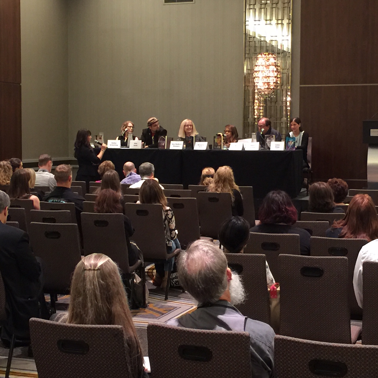 Saturday morning, prepping my YA panelists — Kara Thomas, Bob Stine, Kelley Armstrong in this photo. All the while, I’m hoping I’ll be able to see my tiny notes. Where’s my teleprompter like Oprah has?